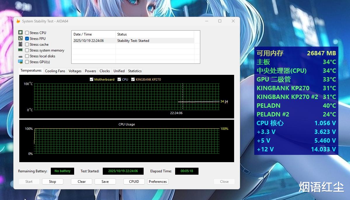 性能如何,散热效果如何?电脑组装好之后,我们还是来通过专业的烤机软件来看一看吧,使用AIDA64进行专业烤机,进行10分钟烤机,得益于Tt钢影木语360水冷散热器的加持,CPU温度平均值在34度左右,并且特别稳定,表现非常好。