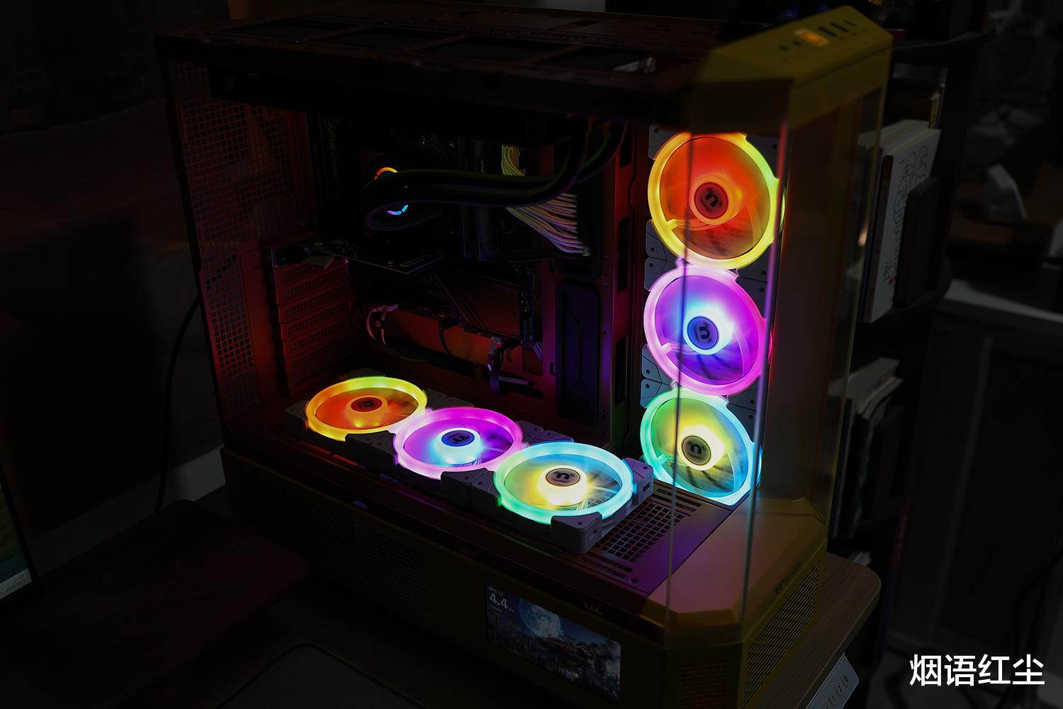 总的来说,Tt光透View600 TG机箱的四面玻璃设计让水冷器的木质装饰和ARGB光效得到充分展示,而水冷器的出色散热性能确保了整个系统的稳定运行。通过TT RGB PLUS软件,可以统一控制水冷、机箱风扇和其他曜越设备的灯光效果,创建和谐统一的视觉体验。数显屏幕与机箱的LCD选配屏幕相得益彰,共同构建了一个信息直观、操控便捷的系统环境。