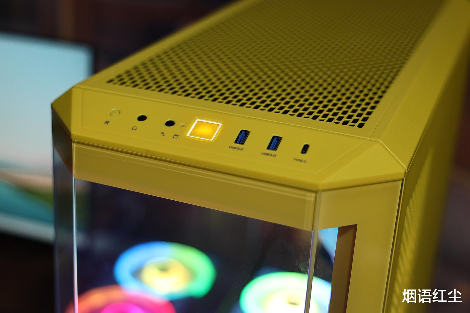 Tt光透View600 TG机箱的I/O面板设置于顶部,配置合理:包含两组USB 3.0、一组USB 3.2 Gen 2 Type-C、HD Audio、重置键及LED电源键,提供了便利的操作接口。独立的耳机和麦克风接口也比较少见,满足了用户对接口齐全性的需求。