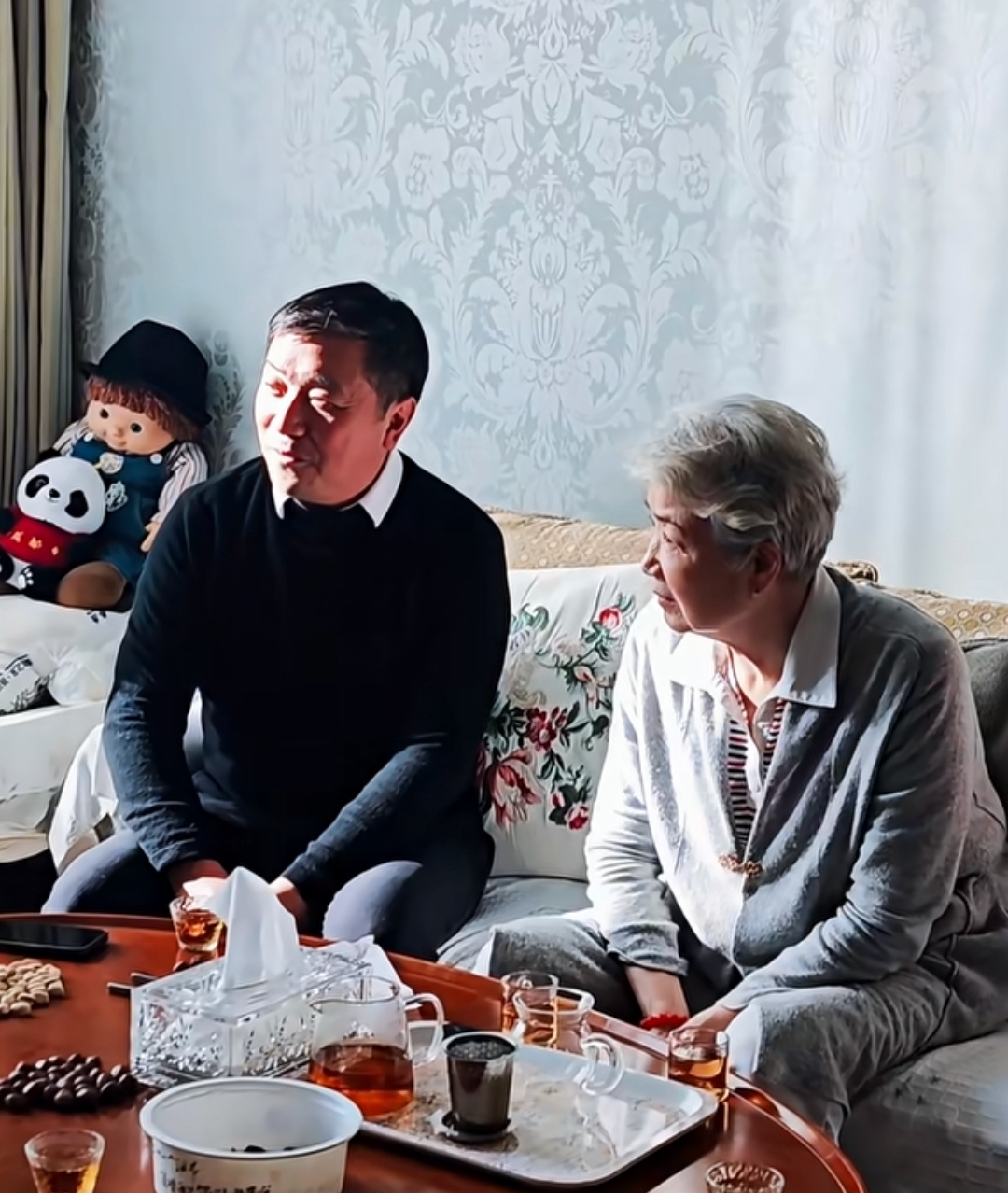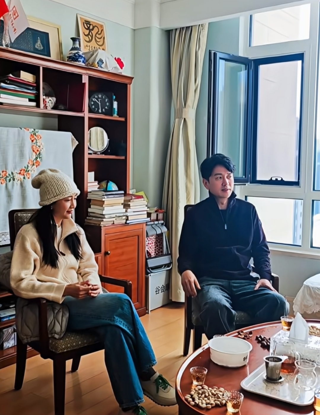 王鸥和王仁君坐在另一边的椅子上,曹翠芬和另一男子坐在沙发上,曹翠芬家里的沙发绣着花,角落还摆着几个抱枕娃娃,看着很温馨。