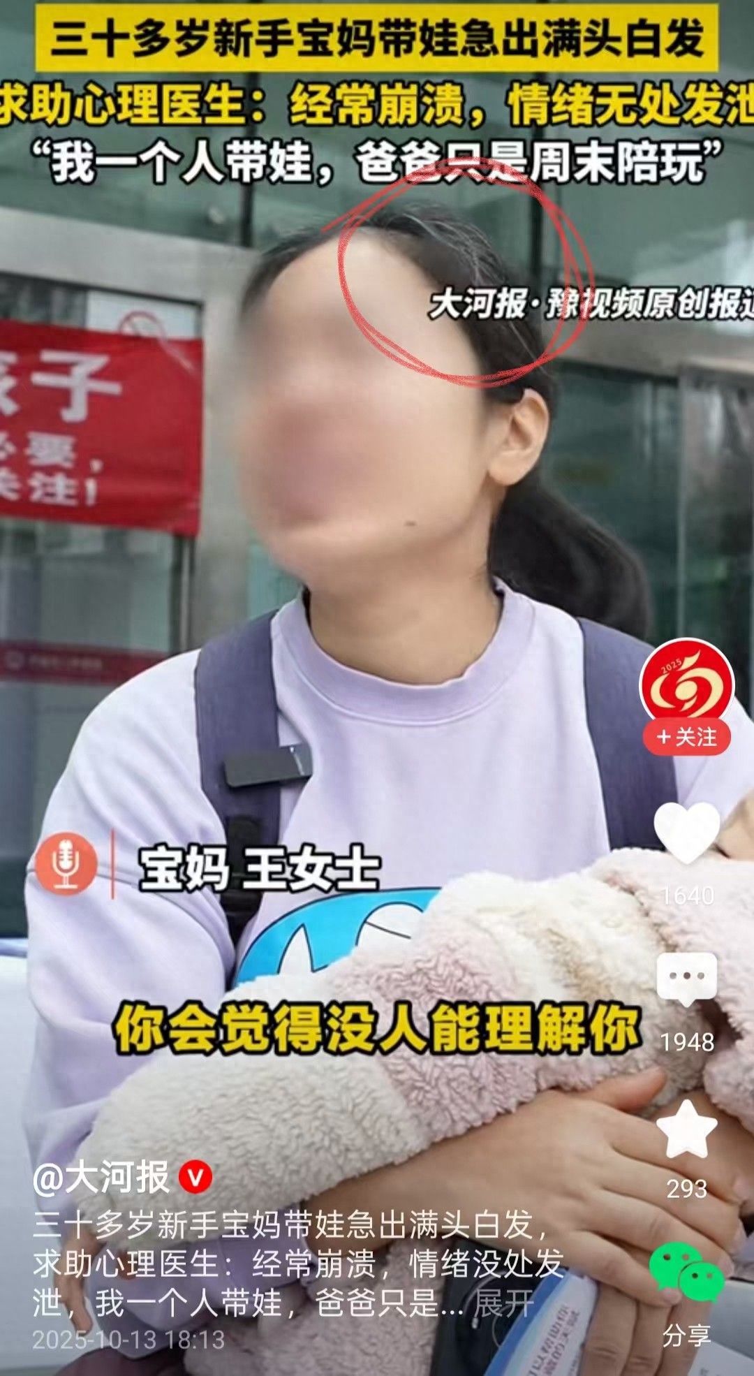 刷手机看到一条挂在热榜上视频:30多岁的新手宝妈带娃,因为焦虑急出满头白发。