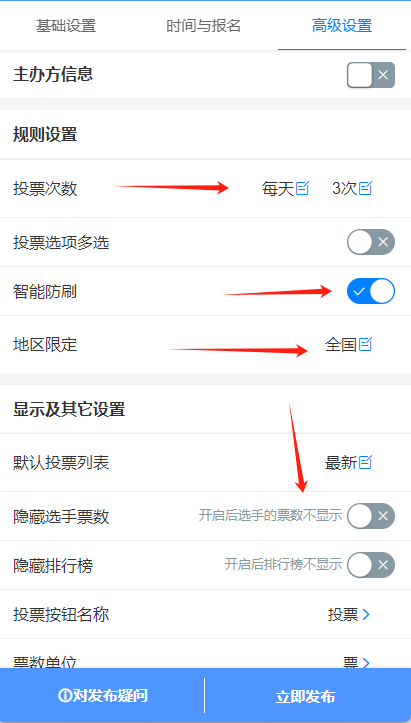 设置投票规则,比如每人每天限投3票?需图形验证?IP限制?建议投开启,防刷效果达到最佳状态!还能隐藏实时排名及票数,有效避免恶性拉票,让活动更公平公正!