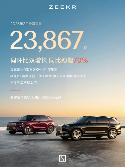 车市里不少品牌的销量数字看着好看,实则在玩数据猫腻,而真正能经得住市场检验的销量,肯定得靠实打实的交付撑着。从实际交付量来看,极氪2025年全年一共交付224133台,用户保有量超60万人,这份成绩是常年做市场积累下来的,根本不是靠短期营销冲量能做到的。就算到了2026年车市的传统淡季,极氪的交付量依旧没掉链子,1月交付23852台、2月交付23867台,旗下的9X、009还在各自的细分市场拿下了销冠,用一笔笔真实的交付数据,证明了消费者是真认它的产品。