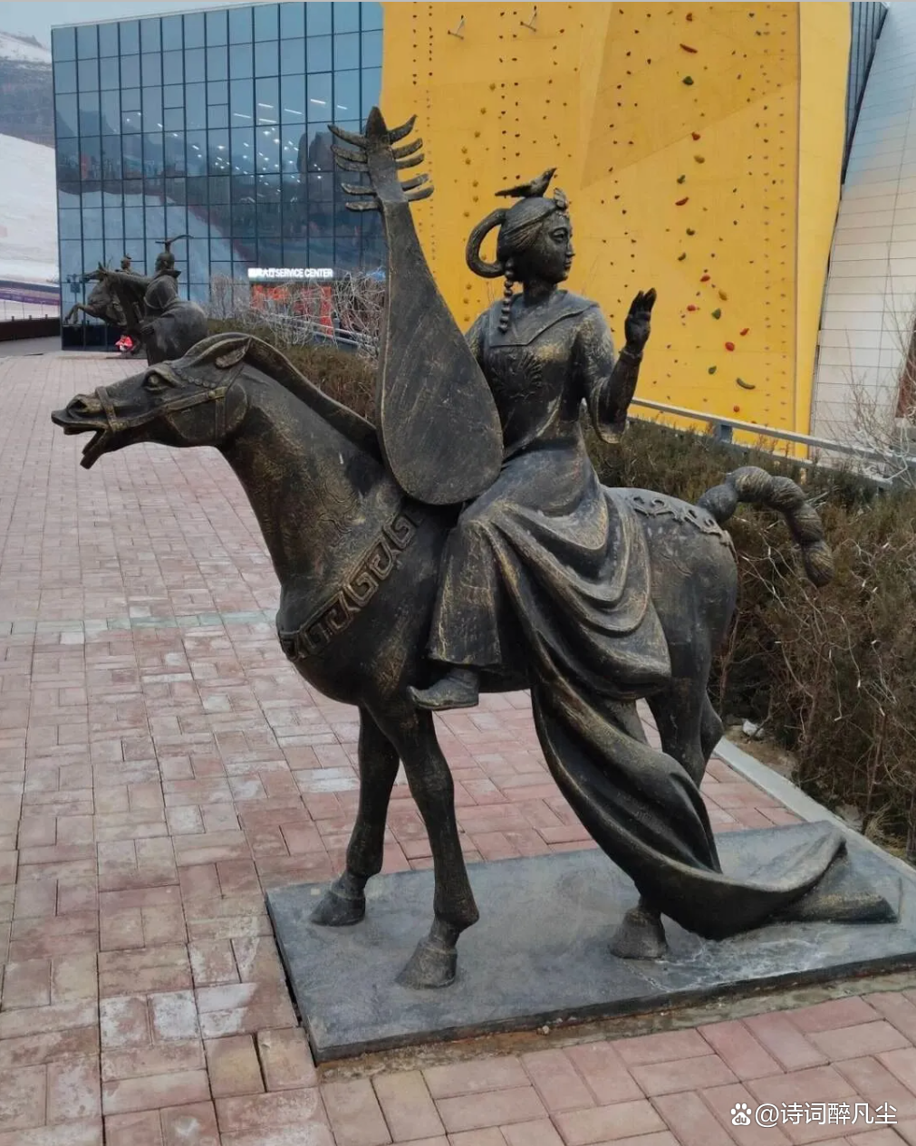 在广武滑雪场,从雪具大厅通往雪场酒店的路上有几尊铜像,其中一尊是表达“昭君出塞”的典故,那几天恰好看到一个新的词牌名“昭君怨”,于是就把这种对滑雪的热切渴盼填进了这首词牌内。