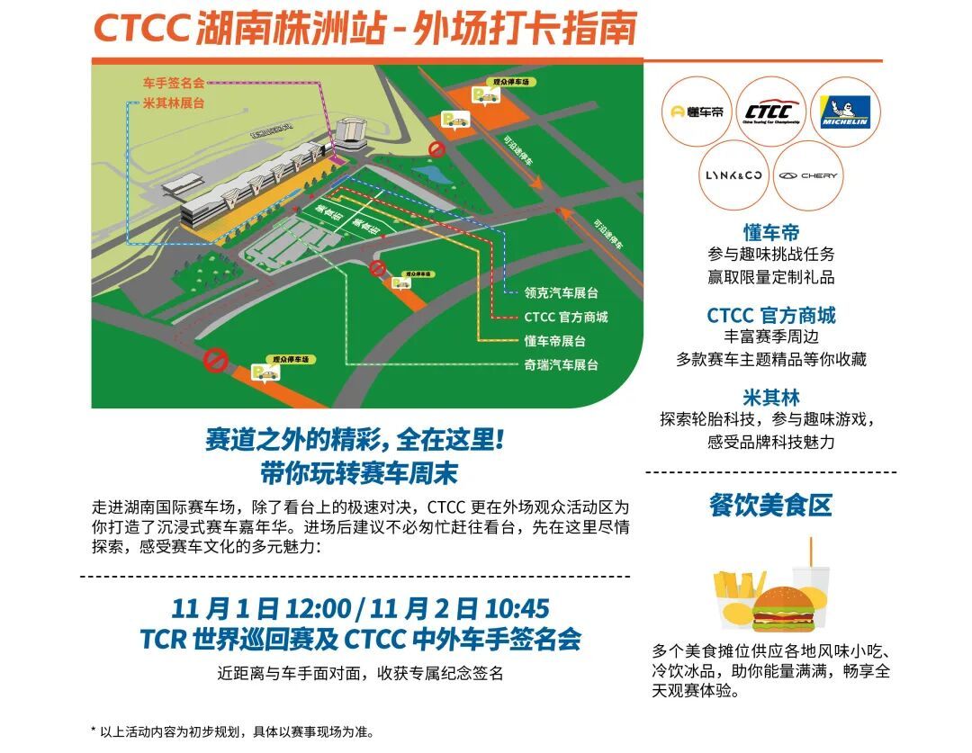 赛场外围,CTCC特别规划了多项互动活动:车手见面会环节将实现车迷与车手的近距离互动;由CTCC与合作伙伴共同打造的商贸区集合了CTCC官方纪念品、创意汽车文化展示和株洲特色美食,并有多彩的趣味互动等待车迷解锁,致力于让每位观众在感受极速激情的同时,也能全方位融入这场赛车文化盛宴。