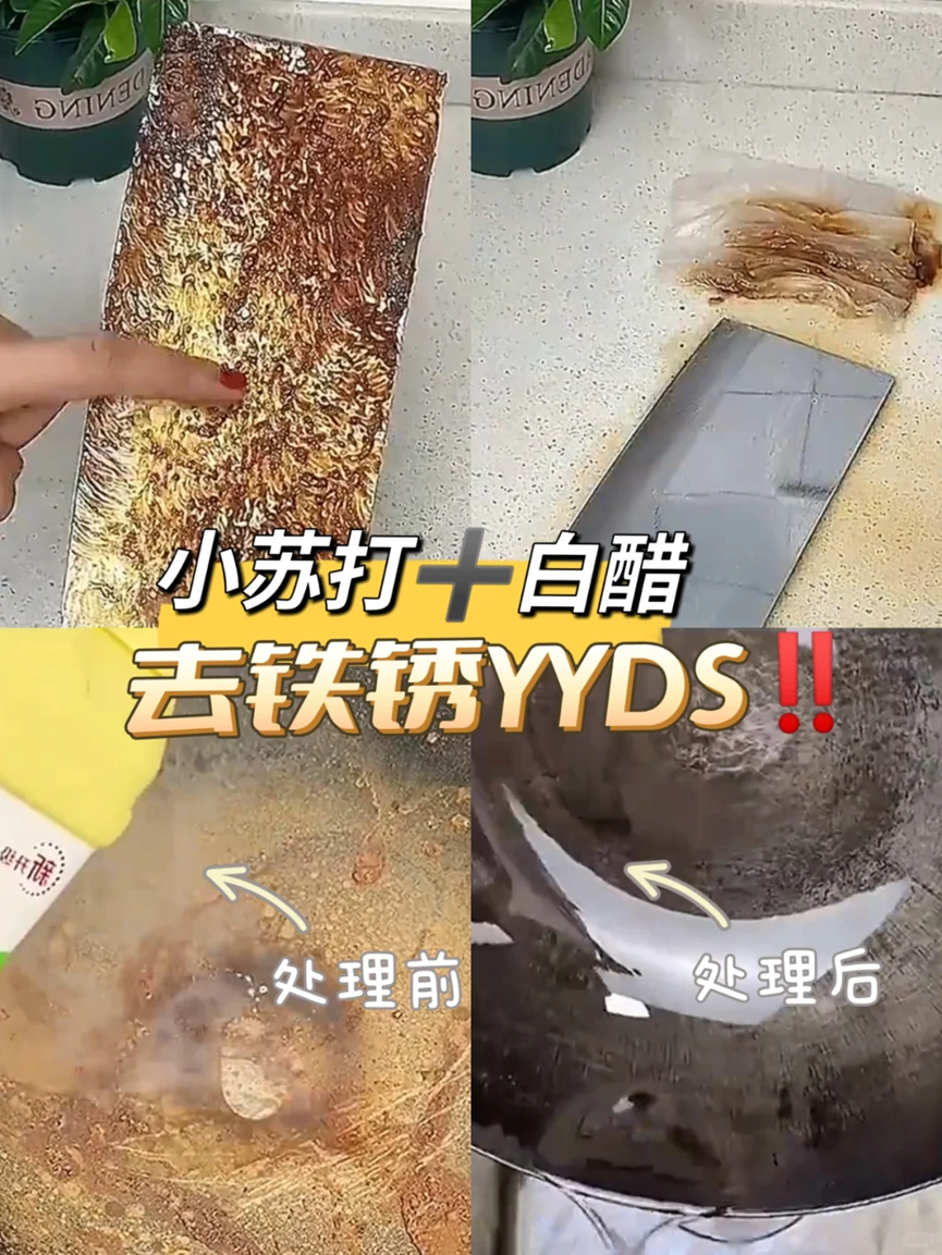 将生锈的铁锅或者是其他的一些物品浸泡在小苏打以及白醋当中,泡一会儿之后再使用钢丝球或者是稍硬一点的洗碗布擦拭干净就可以焕然一新了。
