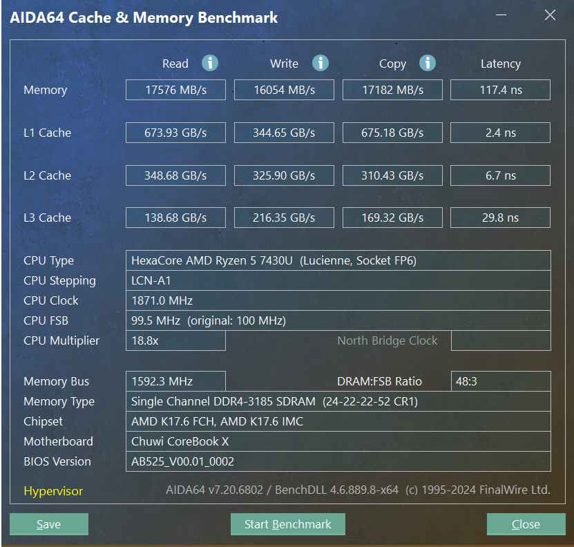 用 AIDA64 测内存,读取17576MB/s、写入16054MB/s;CrystalDiskMark 测硬盘,顺序读取1614.65MB/s、写入2619.28MB/s,开机只要 10 秒,打开大型文档、软件秒启动,不用等半天。