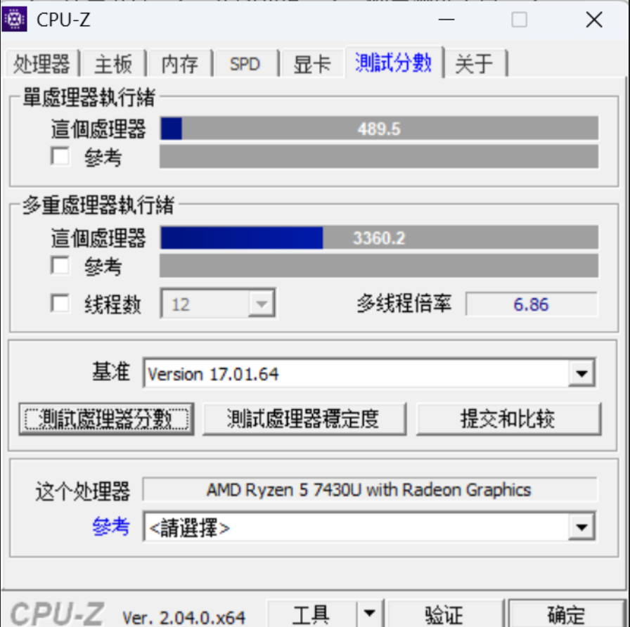 专门跑了分给大家参考:CPU-Z 单核489.5分,多核3360.2分;