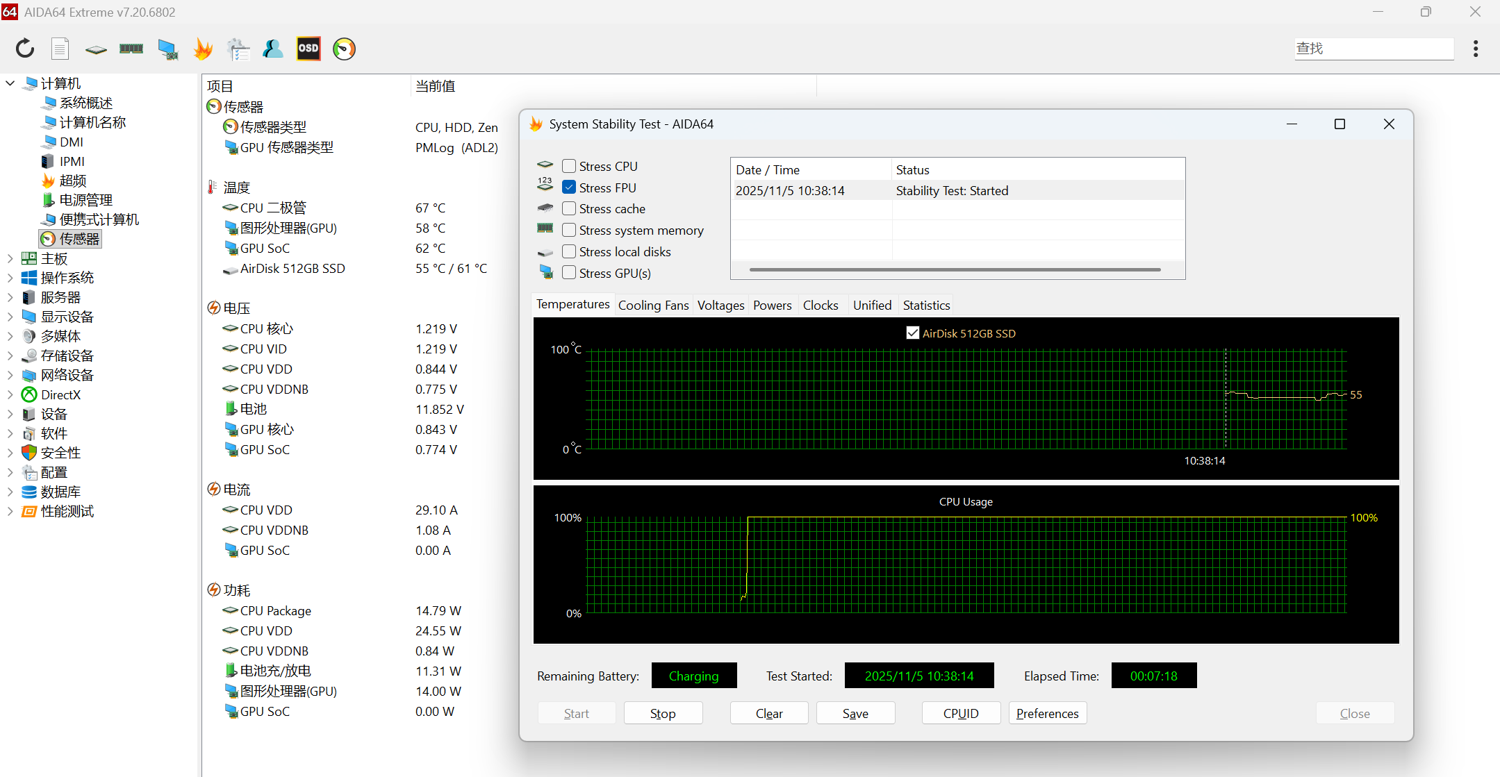 驰为这款笔记本可以通过FN+空格键,开启Turbo性能模式,性能模式下,FPU单烤跑7分钟测试,CPU温度可以牢牢的控制在67摄氏度以内,TDP功耗稳定在15W。