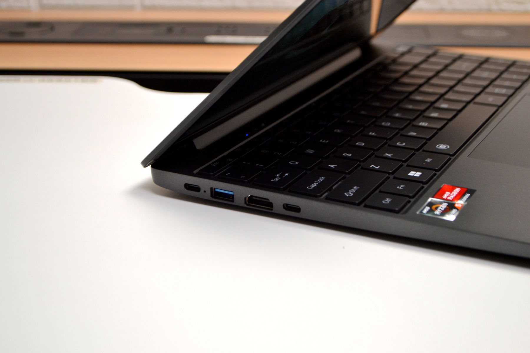 而且驰为的这个本子的颜值也不错,看得出来,驰为在细节上也用了不少小心思:开机键是铁灰色,周边做了丝印红色的装饰片,在沉稳的商务风里添了点精致感;机身正面的 CHUWI LOGO 不突兀,低调又有辨识度。唯一可惜的是,开机键没带指纹模块,每次开机要输密码,稍微有点麻烦,但想想这个价位,其实没有指纹键也合理。