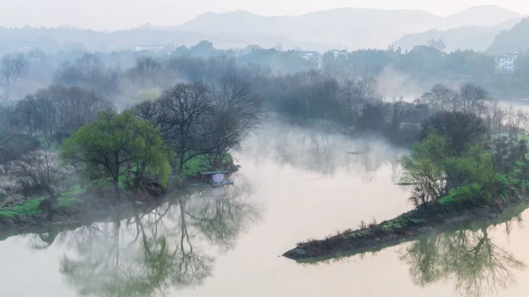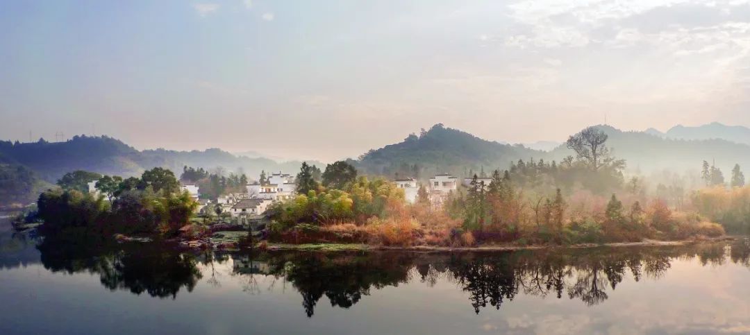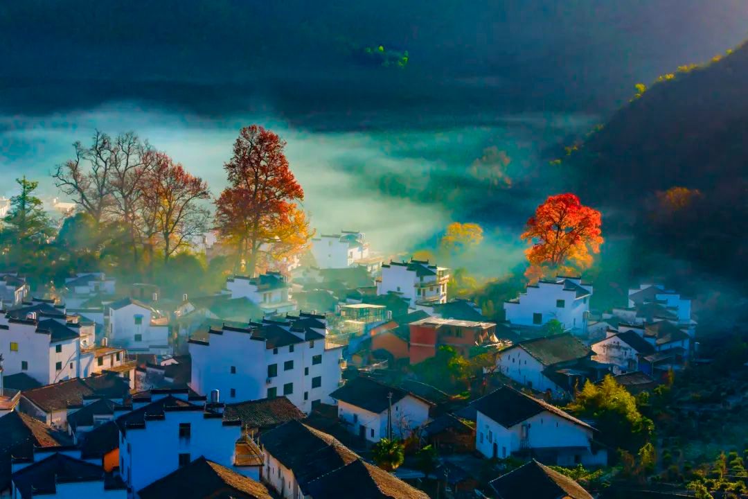 笼罩在晨雾中的山峦跌宕起伏,山下黛瓦白墙组成的古村落在袅袅炊烟中呈现,十分美好。