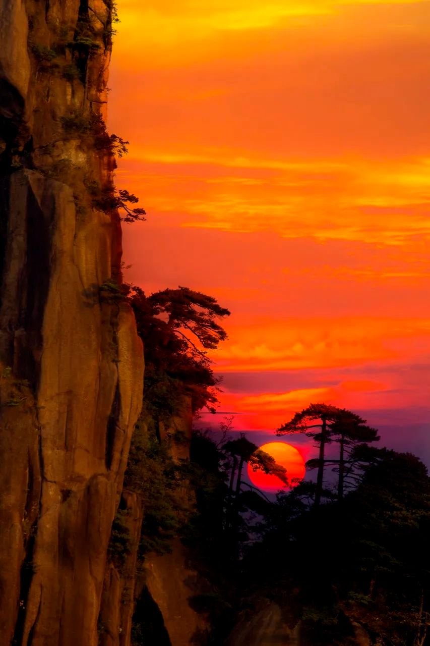 那山崖绝壁上的苍松翠柏,有的悬挂于万仞绝壁,有的交叉于山谷之间,有的屹立于峰巅之上,千姿百态,奇特动人。