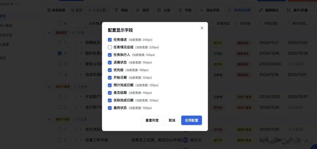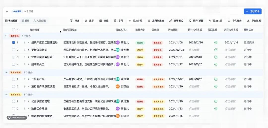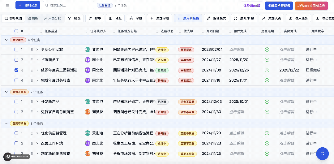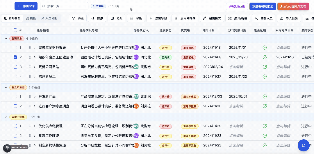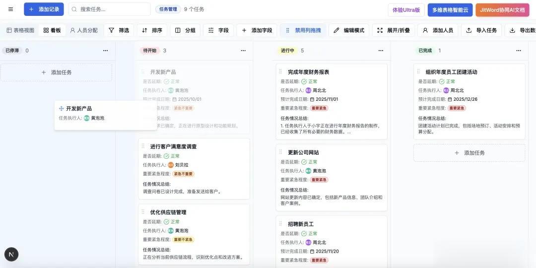 1. 多视图支持 - 表格视图、看板视图、人员分配视图,满足不同场景需求