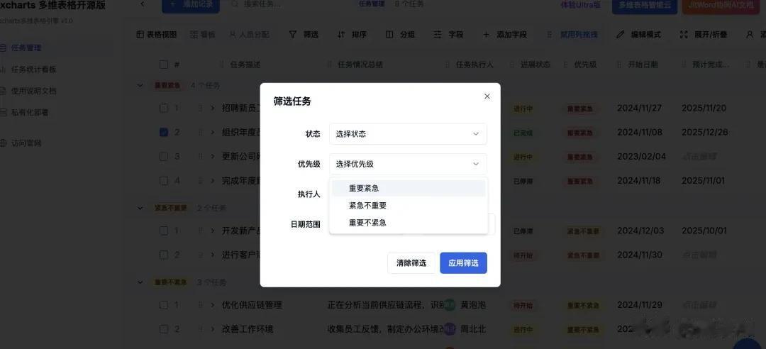 其实我在3年前就开始研究多维表格的应用场景和技术实现了,之所以要做,是因为目前市面上没有比较好的开源方案,更多的只是对基础表格的封装,并不能达到复杂的业务管理和多视图管理的能力。