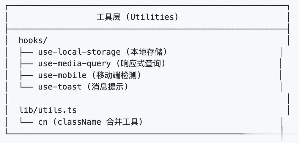 应用层App Router,处理路由和页面级配置视图层独立的视图组件,负责不同功能模块的展示业务组件层可复用的业务组件,封装特定业务逻辑UI组件层通用UI组件,无业务逻辑数据层统一的状态管理和数据操作工具层公共工具函数和自定义Hooks所有的分层模块我都采用了企业级组件架构,下面简单给大家介绍一下: