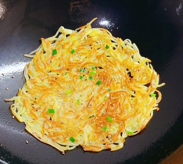 起锅烧热,倒入比平时炒菜稍多一点的食用油。待油温升高,用筷子夹起一簇混合好的土豆丝,轻轻放入锅中,并迅速用锅铲将其摊薄、压平,整理成圆饼状。转用中小火慢煎,耐心等待底面定型、变得金黄脆硬。这时,用铲子小心地翻转,煎制另一面。整个过程中,那滋滋的声响与逐渐弥漫开的焦香,便是最诱人的信号。待两面都煎至金黄酥脆,即可捞出控油。刚出锅的土豆饼是最美味的,边缘焦脆,内里还带着土豆丝些许的柔韧,混合着简单的咸香与椒麻,一口下去,满是扎实的满足感。