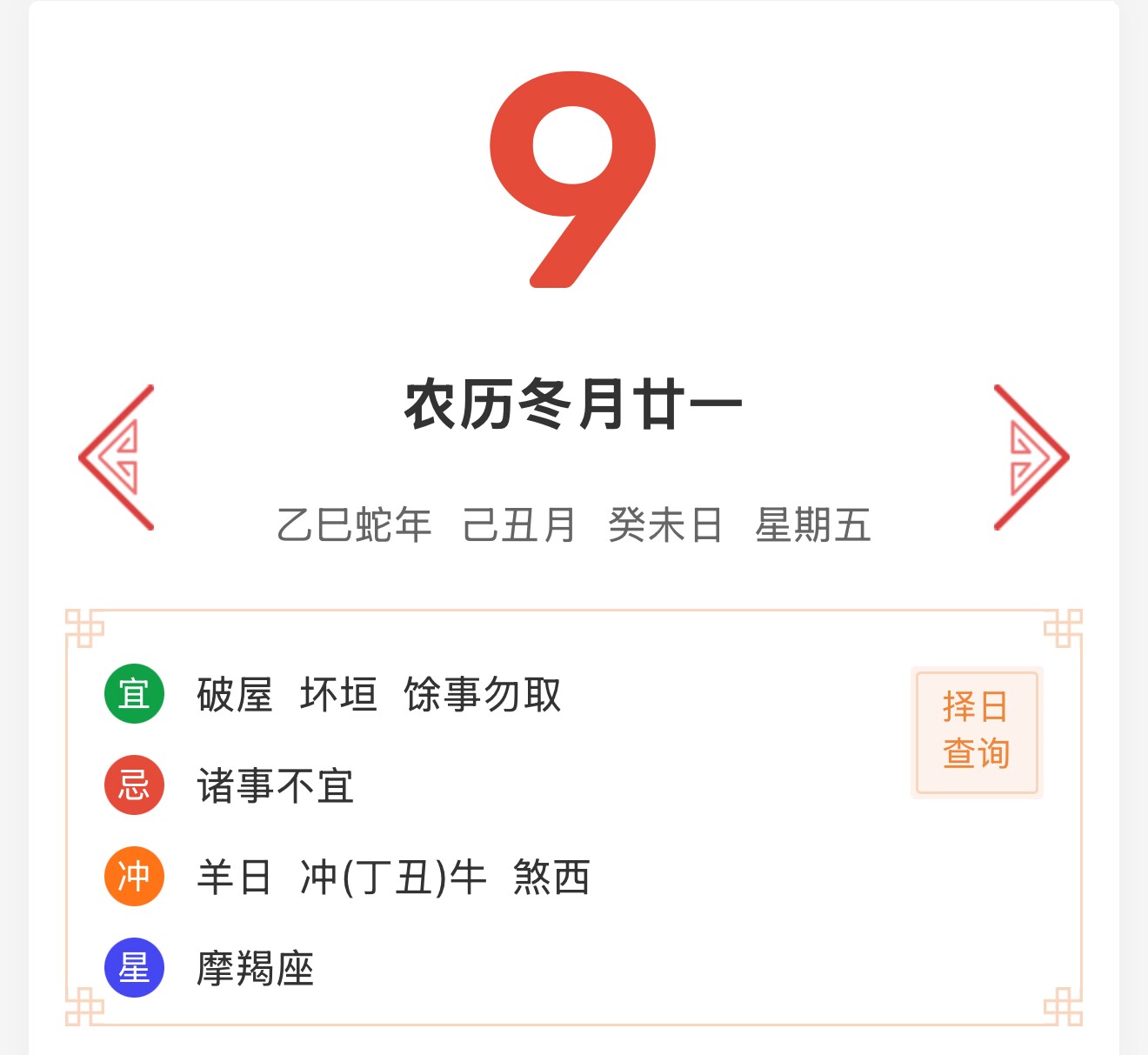 2026 年 1 月 9 日(农历冬月廿一,乙巳蛇年己丑月癸未日)为羊日冲牛煞西,吉神天恩、普护与凶煞月破、大耗并存,核心特质是 “除旧布新需谨慎”—— 既藏清理契机,又隐变动风险。
