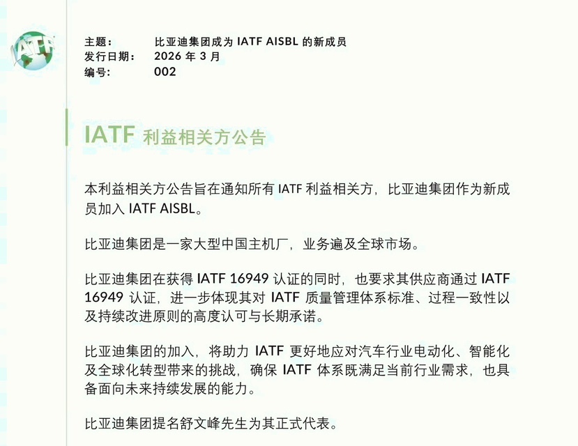 3月11日,比亚迪正式加入国际汽车工作组(IATF),成为全球首个且唯一的新能源车企,这意味着其成功跻身全球汽车核心标准制定阵营,与大众、福特、宝马和通用等老牌巨头一起,共同执掌全球汽车质量管理体系的规则制定权。