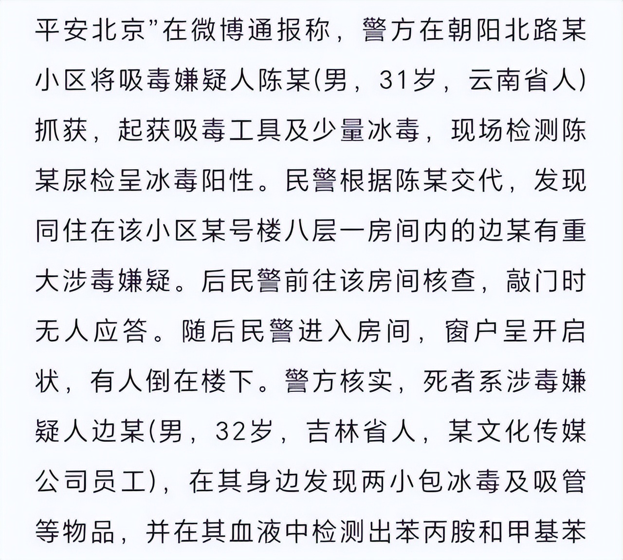 警方后来通报,陈柏君被抓时,为了减轻罪责,供出边策也涉毒。6月9日凌晨2点多,警方接到朝阳群众举报,赶到小区抓了陈柏君,他当场交代和边策一起吸过。