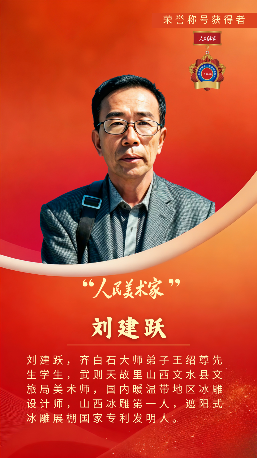 刘建跃,师从齐白石弟子研习水墨花鸟,独创暖温带冰雕艺术斩获国家专利;从三尺画案深耕笔墨,到踏遍晋冀鲁豫甘五省举办展览三十二载;从无偿勾勒乡村文旅景观,到俯身助力农民冰雪文化生活,刘建跃的艺术人生,始终贯穿着对技艺的执着追求与对人民的赤诚担当