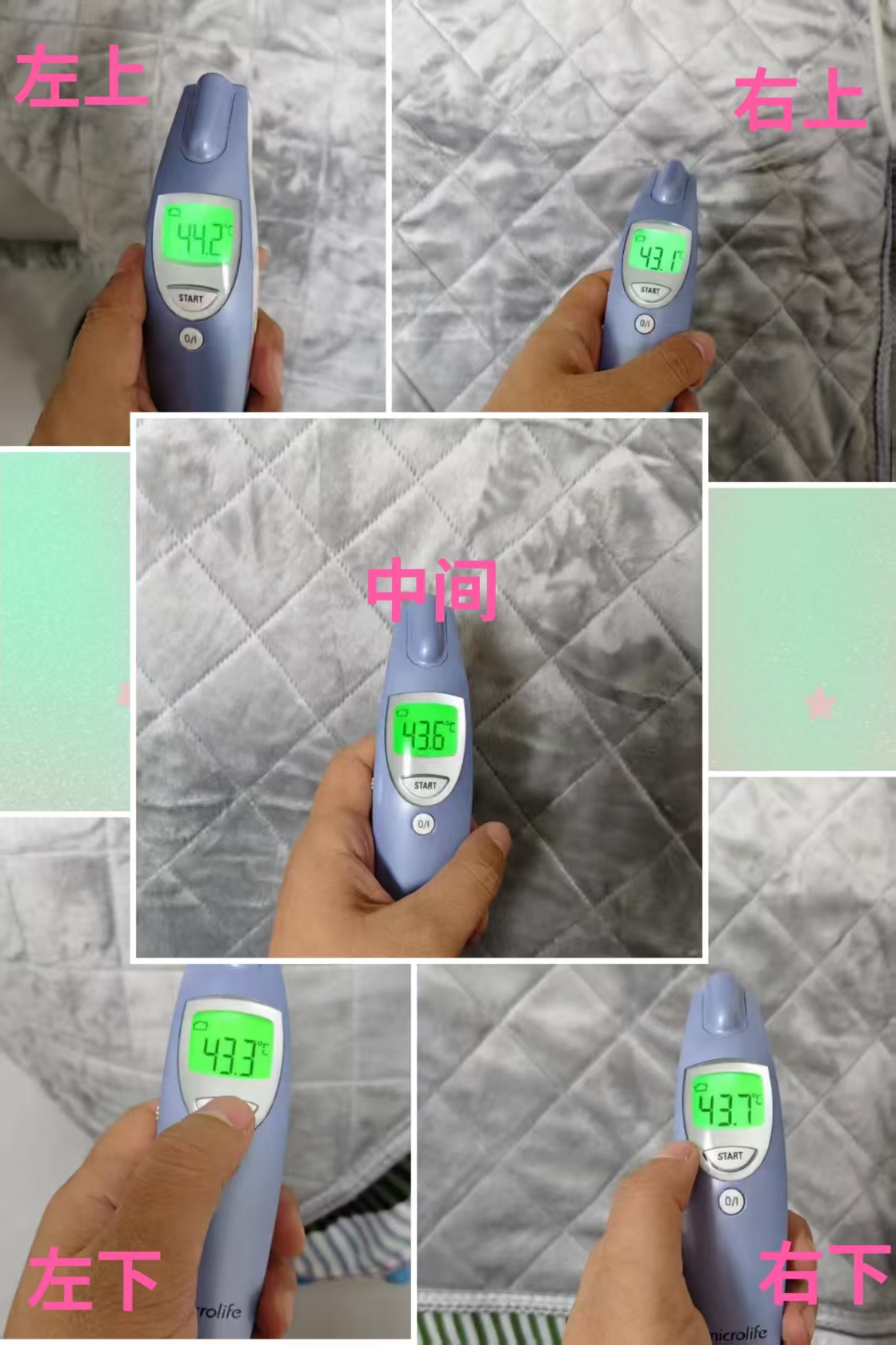 实测结果如下:温度依次为:44.2℃、43.3℃、43.1℃、43.7℃、43.6℃,最大温差仅1.1℃;