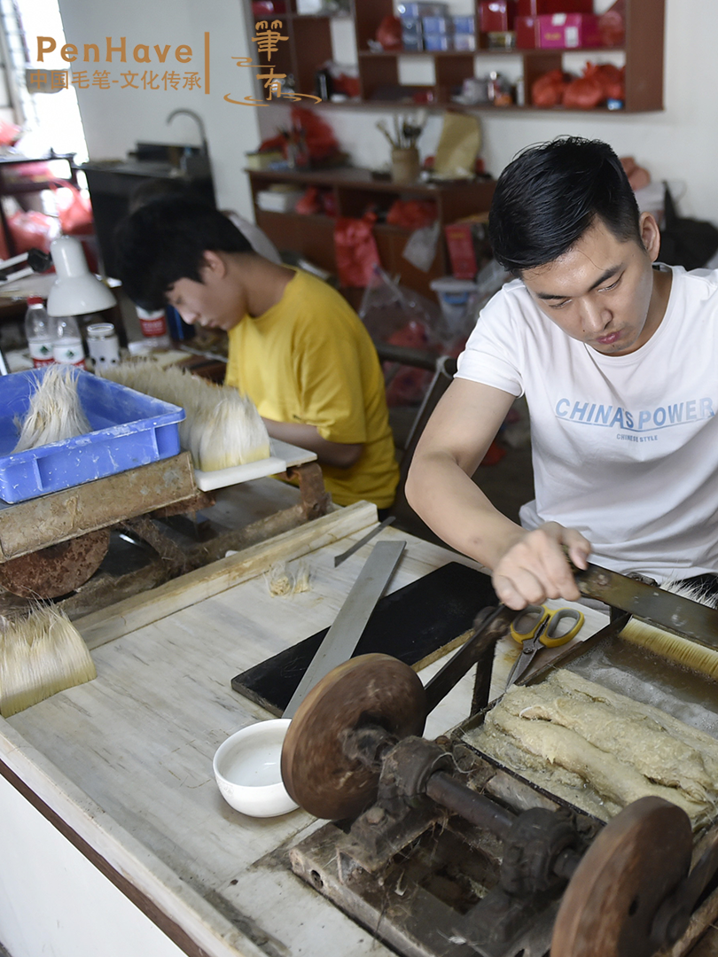 一支合格的文港毛笔,从选料开始,到最终成品,要经历128道极为繁琐的工序。这128道工序主要分为水盆、结头、装套、择笔、刻字等几大环节,每一环节又细分出无数个动作。