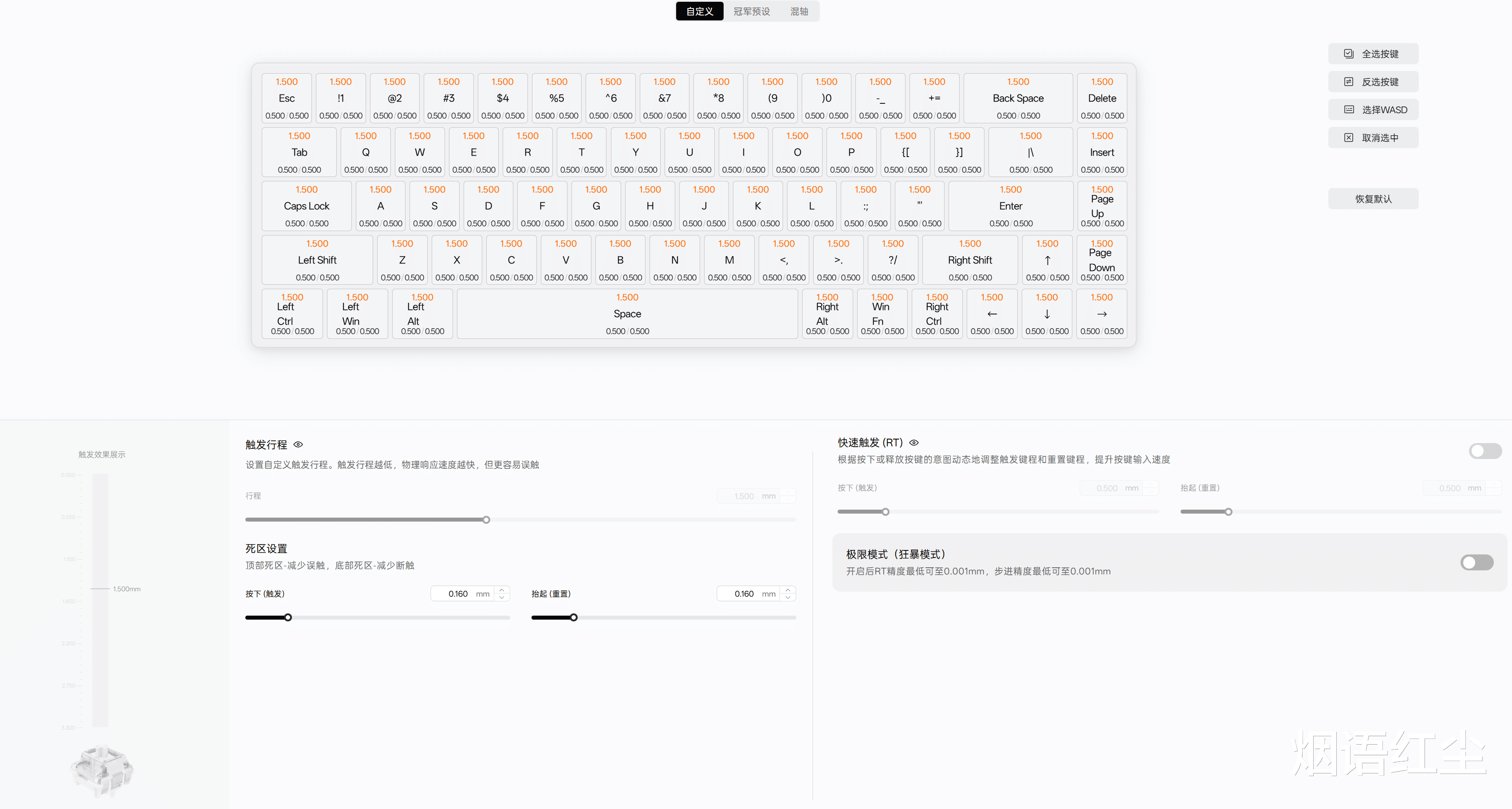 万磁王轴的初始磁通量为100±15GS,触底磁通量可达640±60GS,确保了触发的精准度和一致性。这种设计使得键盘寿命大幅提升,真正做到了“一次投资,长久使用”。 磁轴技术最吸引人的地方在于其可调节触发键程的功能。我们可以通过驱动软件,根据个人习惯和不同游戏的需求,自定义每个按键的触发点。无论是追求极速触发的FPS游戏,还是需要防止误触的MMO游戏,ATK RS6 Ultra都能完美适应。