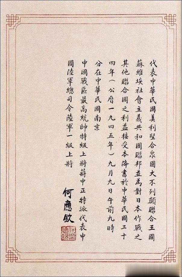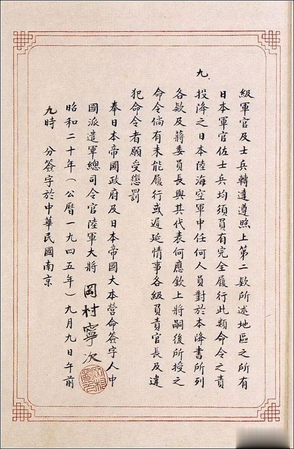 1945年9月9日,中国战区受降仪式在南京原中央陆军军官学校大礼堂举行。9时正,日本投降代表冈村宁次在日本降书上签字,9时6分何应钦在日本降书上签字受降。9时8分何应钦将蒋介石《中国战区最高统帅命令第一号》交由萧毅肃转交冈村宁次,冈村签字盖章。9时10分,受降仪式结束。至此,侵华日军128万余人向中国投降,伟大的抗日战争取得最终胜利。随后,何应钦通过广播发表讲话: