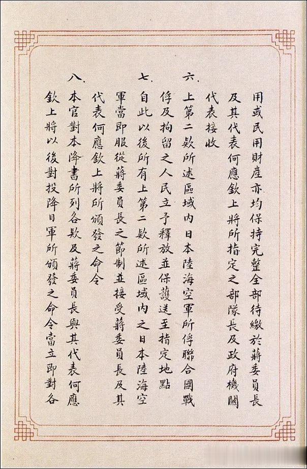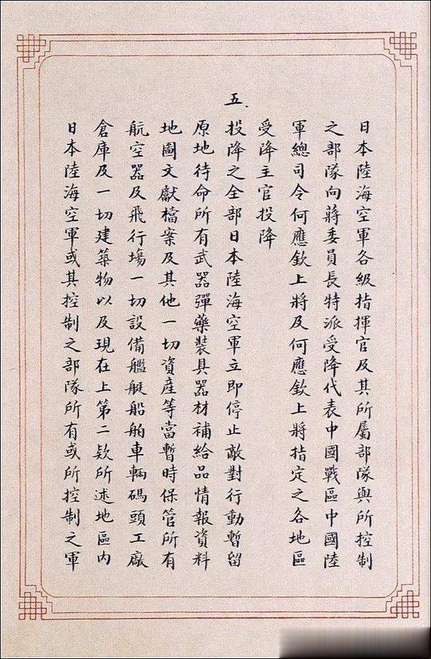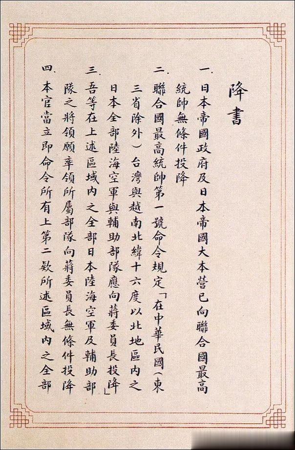 敬告全国同胞及全世界人士:中国战区日军投降签字已于本日上午九时在南京顺利完成,这是中国历史上最有意义的一个日子;这也是八年抗战艰苦奋斗的结果。东亚及全世界人类和平与繁荣,亦从此开辟一新的纪元。