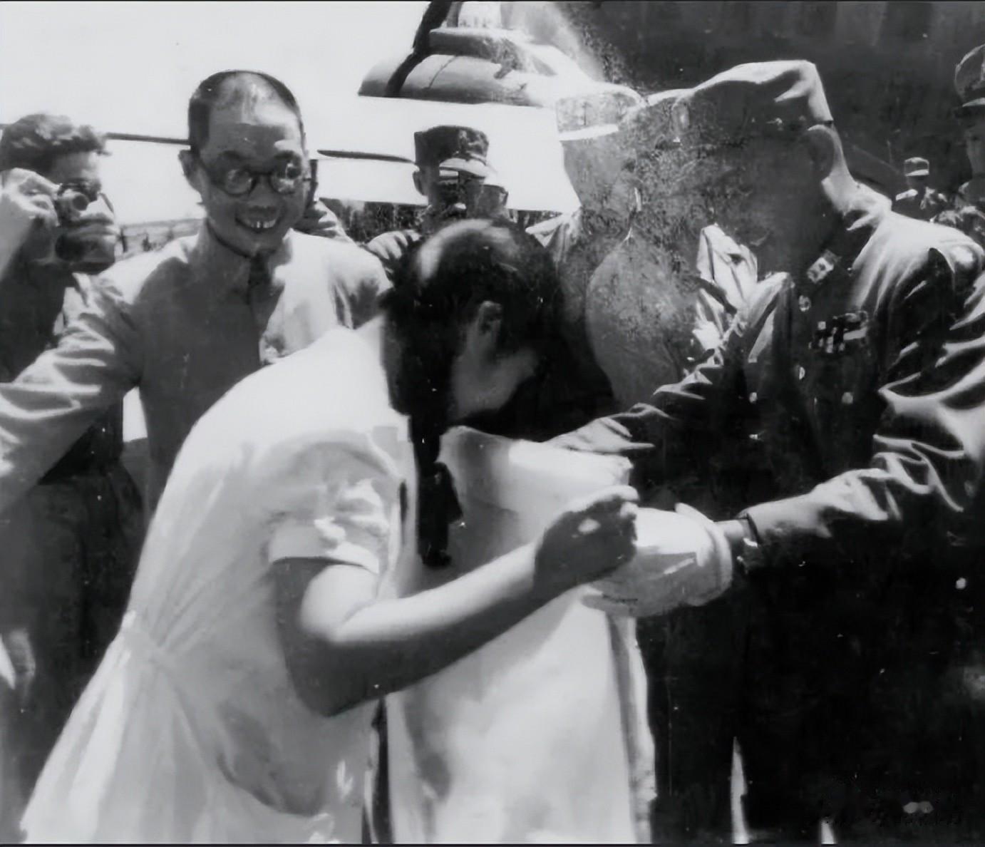 张发奎(右三)和美国陆军准将鲍曼(右二)抵达广州白云机场