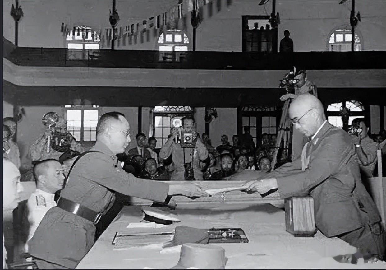 1945年10月25日,中国台湾警备总司令陈仪台湾总督兼第十方面军司令官安藤利吉台湾日军受降签字仪式。
