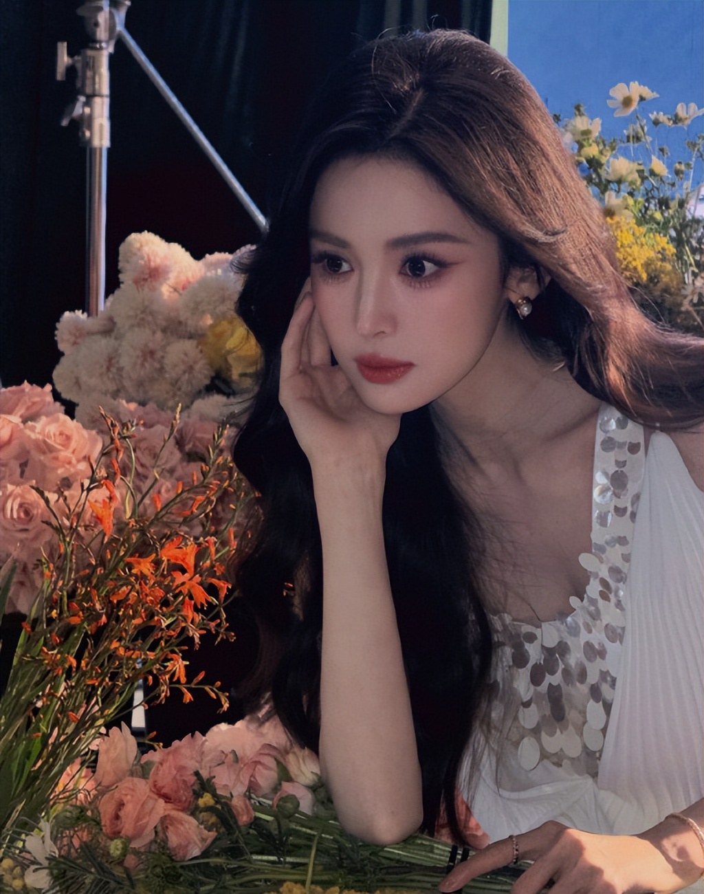 照片中她像是一个花仙子,被很多束花朵包围着,整个人的状态也非常不错。