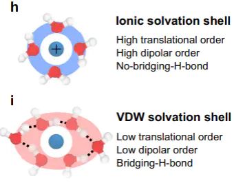 这是离子型溶质与溶剂分子间最主要的作用力NaCl图示意溶液中Na⁺/Cl⁻的第一溶剂壳及壳内氢键链部分恢复水的四面体结构。10.1038/s41467-022-28538-8