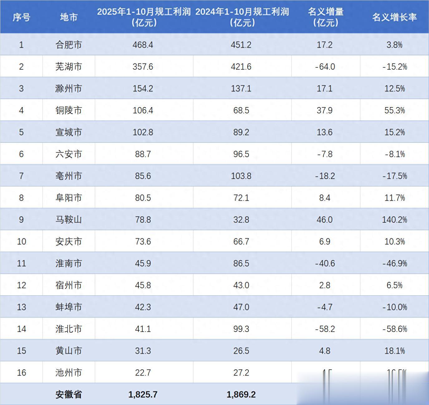 根据统计部门公布的数据,2025年1-10月份,安徽全省规模以上工业企业共实现利润总额1825.7亿元,较上年同期减少43.5亿元,名义下滑2.3%,整体仍略呈低迷,下辖地市情况如下: