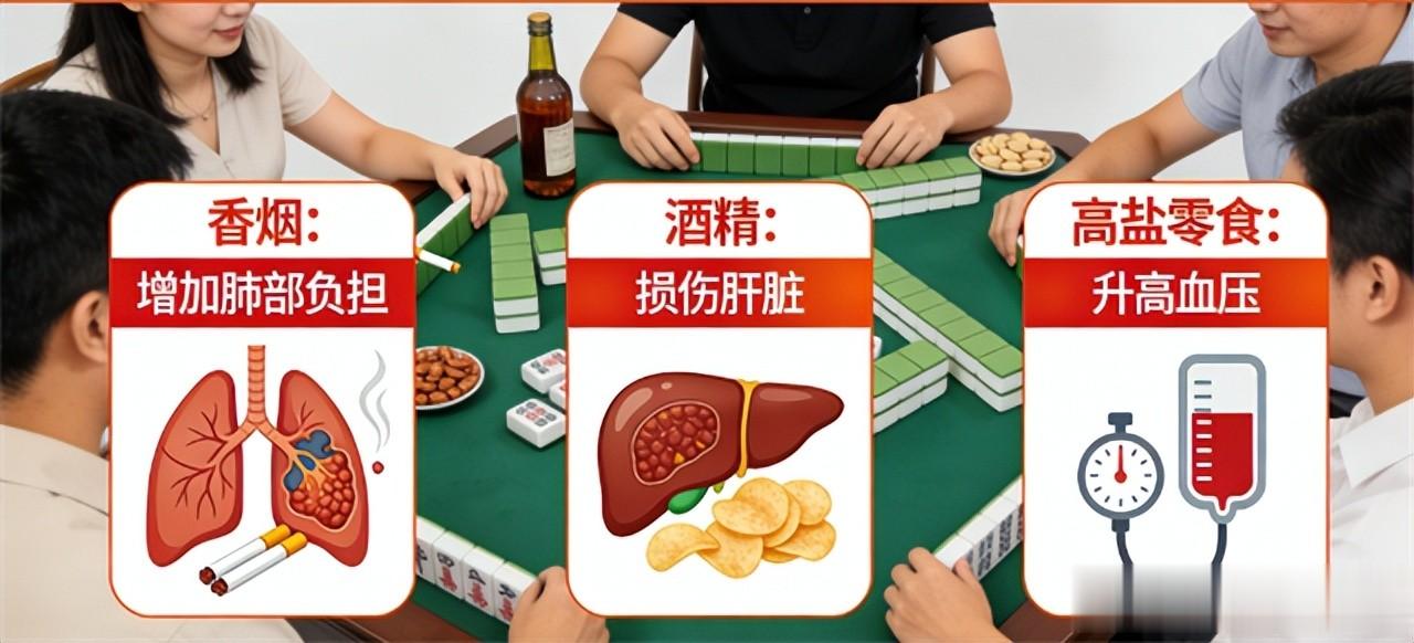 打麻将,还要注意声音、烟酒与环境因素同样重要。很多麻将桌上伴随有香烟、酒精和高盐零食,这些看起来像是“社交调味剂”的习惯,实际上对身体有实实在在的影响。吸烟不只是刺激气味,烟草烟雾中含有上千种有害化学物质,会损伤肺部、干扰氧气交换,还会破坏血管和心脏功能,增加心血管疾病和呼吸系统疾病风险,连二手烟对旁人也有危害。
