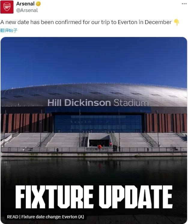 官方:阿森纳宣布英超第17轮客战埃弗顿的比赛改期,这场比赛原定于当地时间12月21日14点进行,现在提前一天,改为当地时间12月20日20点进行。