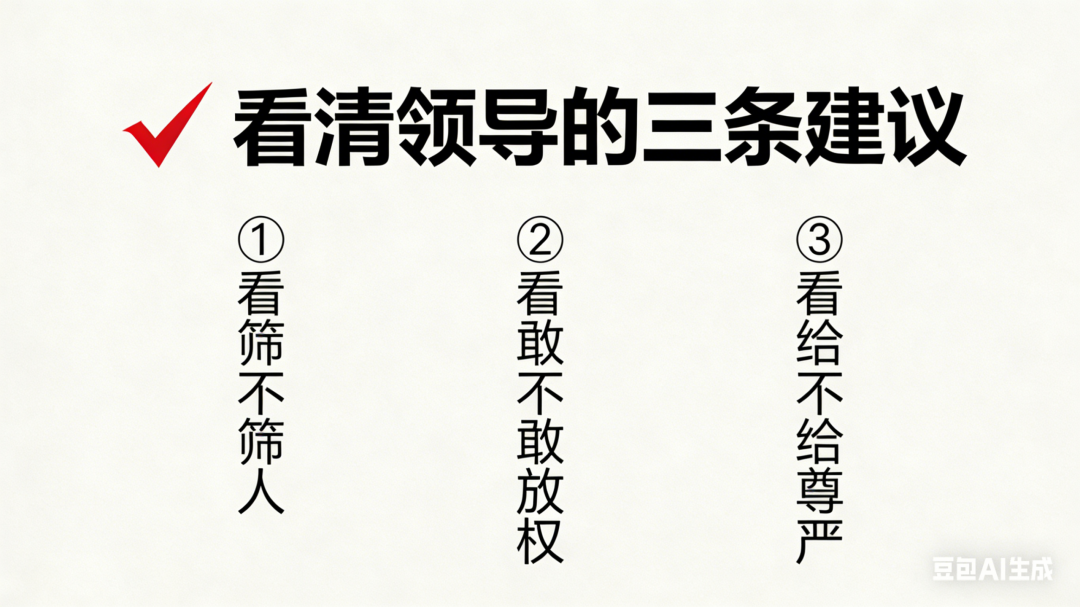 想留人,先看领导筛不筛人。 心不齐的,领导想筛掉;不好用的,领导也想筛掉。留下的如果都是“听话的工具”,别指望这个队伍有战斗力。权力下沉?看领导敢不敢。 如果领导什么都攥在手里,一线的人没权拍板,那说明他根本不信你。这样的队伍,别谈什么凝聚力。尊严比钱更值钱。 领导把你当工具,你就只干工具的活。领导把你当人,你才愿意把心交给他。尊重是相互的,不是你单方面“感恩”。看懂这一句,少走三年弯路。