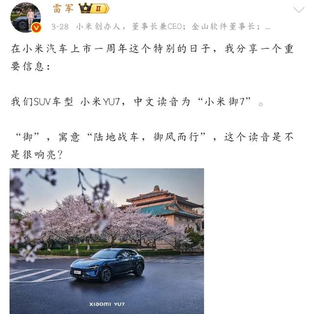 其庐山真面目在去年底由雷军亲自揭开,前些日子雷军通过社交媒体发布信息,公布小米SUV车型“小米YU7”中文读音为“小米御7”,“御”寓意“陆地战车,御风而行”。