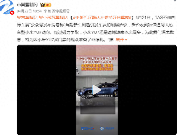 4月21日,苏州国际车展公众号正式宣布,“小米YU7遗憾缺席本次展会,为此我们深表歉意,特为因小米YU7买门票的观众准备了补偿礼。”