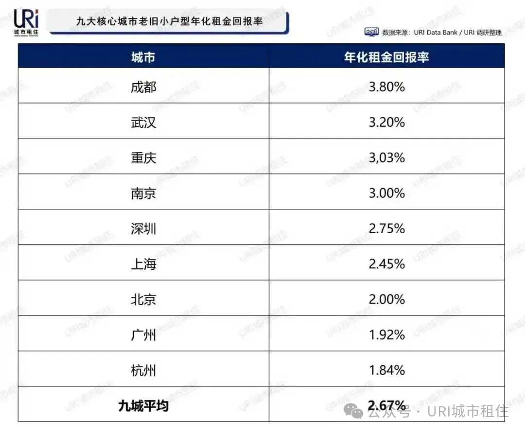以下为九大重点城市老旧小户型租金回报率与主流金融产品收益的对比,具体房源因区位、楼层、装修不同会存在差异,个别城市出现的超高回报率仅为特例,不具备普遍代表性。本文统一计算口径:年化租金回报率 =(月租金 ×12)/ 房屋总价。