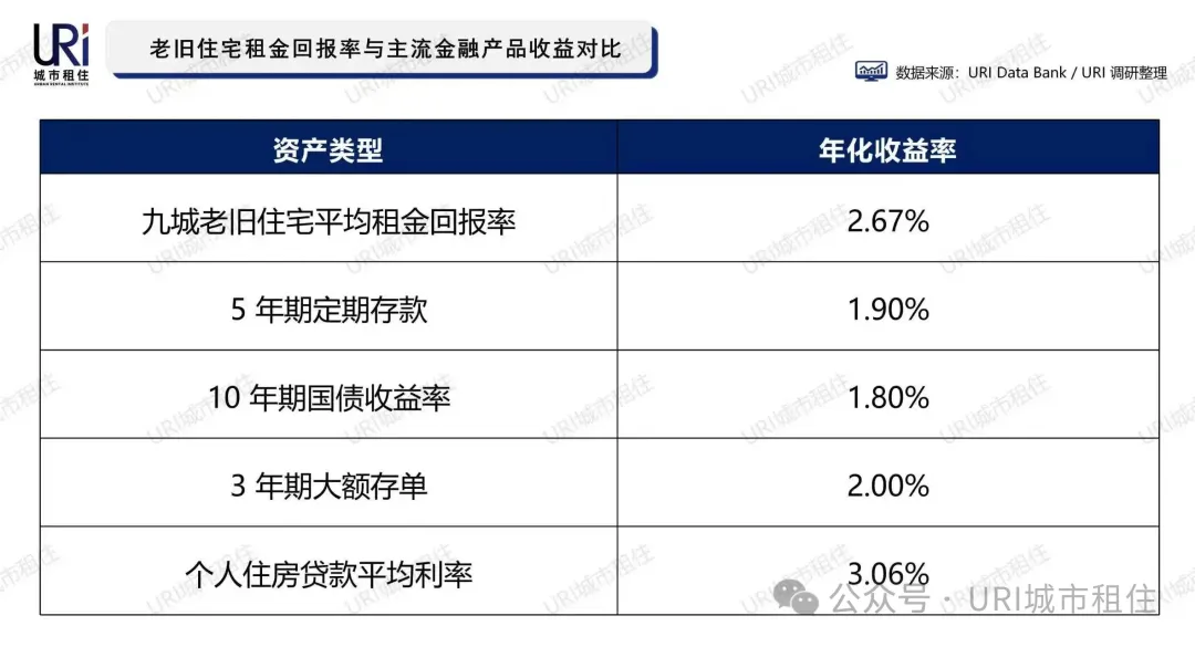 从整体收益水平来看,当前低总价老旧住宅的租金回报率已经全面超越银行存款类产品,并逐步贴近住房贷款利率水平。九大重点城市平均回报率2.67%,明显高于5年期定存、10年期国债以及3年期大额存单;与当前3.06%的房贷利率相比已十分接近。叠加部分城市房贷利率已跌破3%的现实条件,意味着通过按揭方式购入优质标的,租金收入可基本覆盖月供支出。对于倾向配置人民币资产、看重核心城区区位价值的投资者而言,这类老旧住宅已具备类固收资产的配置价值。