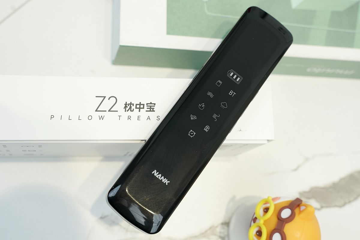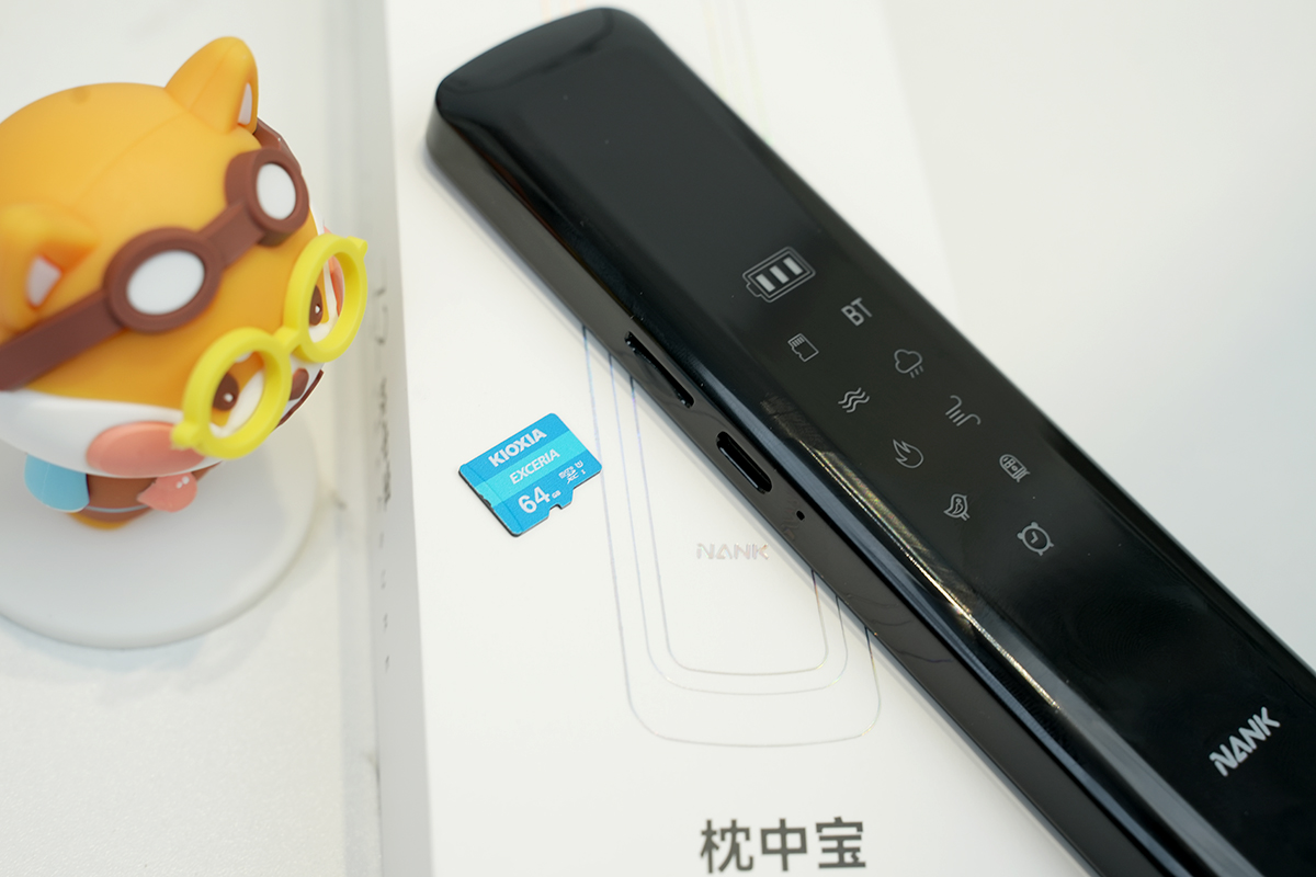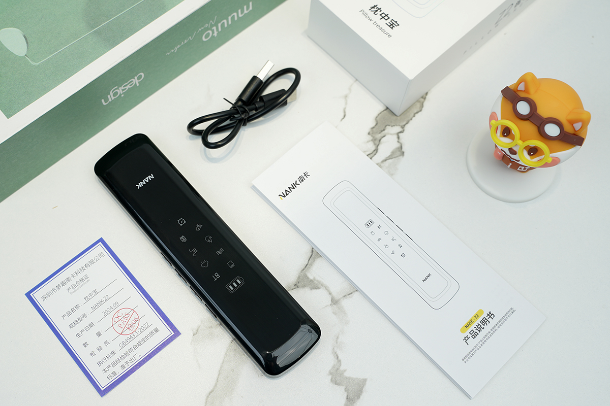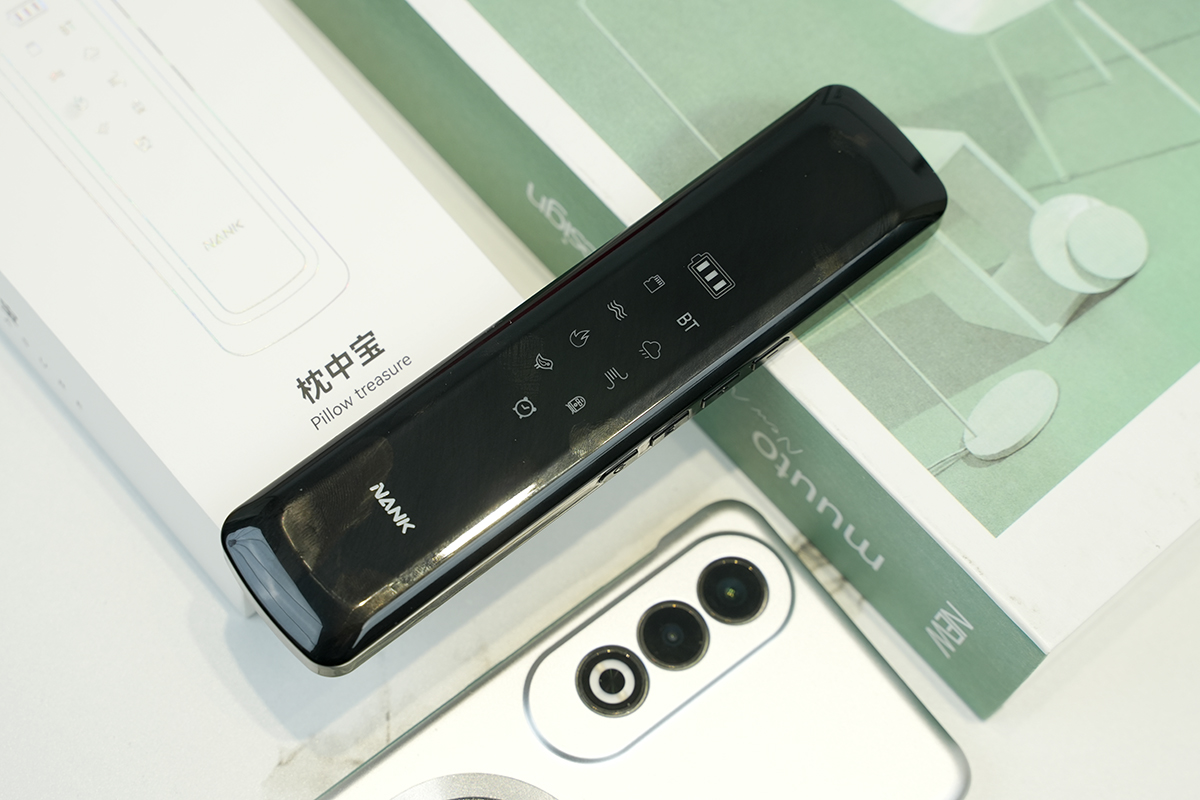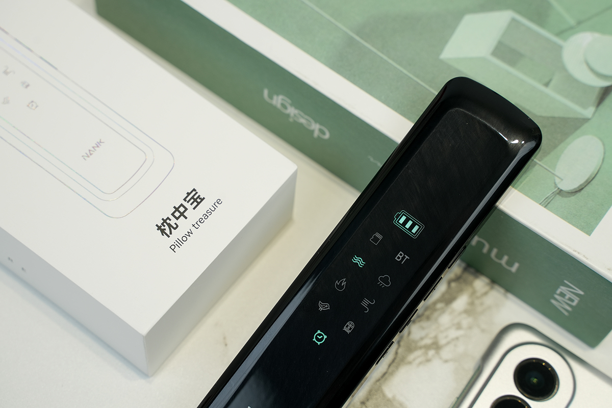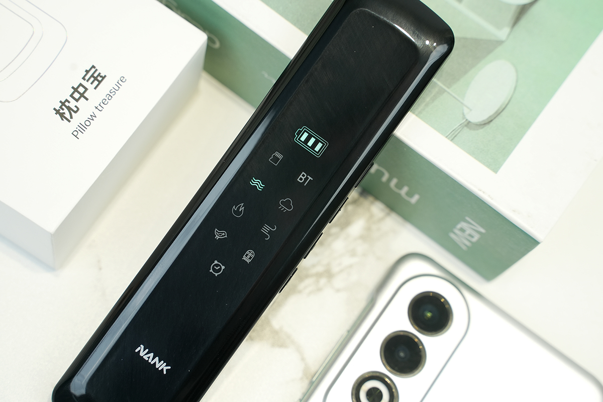取出音箱,它的外观给人第一印象是简约而不失时尚,精致且独具匠心。整体为黑色PC材料,正面显示面板采用光亮的烤漆材质,搭配功能指示灯图标,非常醒目。背面为磨砂材质,放在枕头下面不易滑动。四角圆弧形设计,周身没有一点棱角,握感舒适,使用更加的安全。尺寸小巧宛如点读笔,重量更是轻盈,仅有 54 克,放在枕头下面宛如无物。外出旅行出差,携带也很方便。