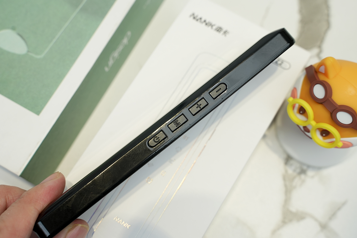 它的右侧为四个实体按键,从上到下分别为音量减号键、音量加号键、M键、开关机键。M键用来切换蓝牙、TF卡和白噪音模式播放。开关机键需要长按 3 秒开关机,夜晚盲按情况下有效防止误触。它的左侧为TF卡槽、Type-C充电接口和指示灯。