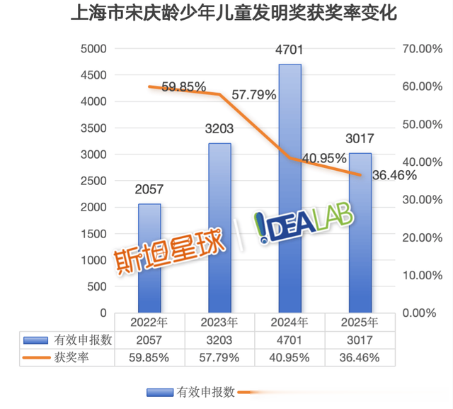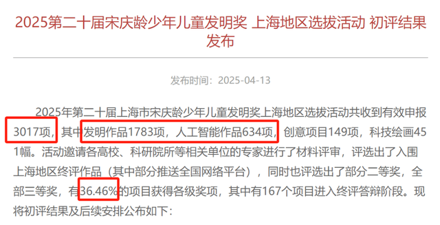 近日,2025年第二十届上海市宋庆龄少年儿童发明奖选拔活动公布初评结果,获奖率持续走低!