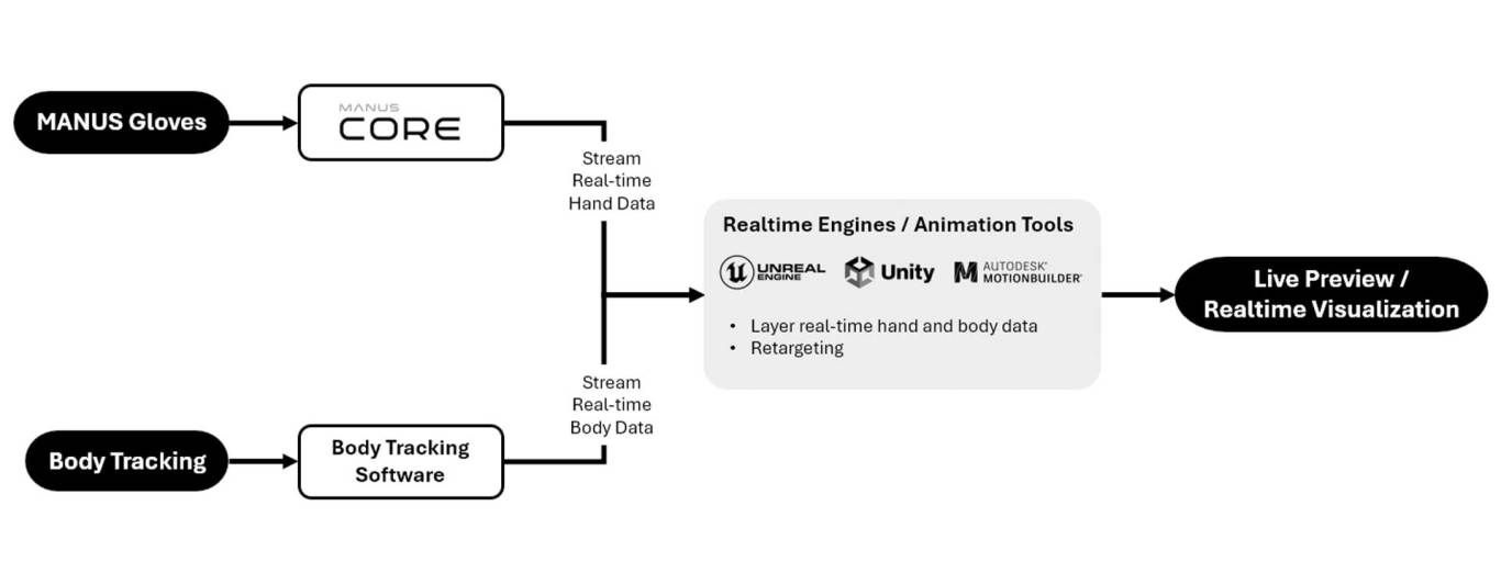 当身体运动捕捉或跟踪数据需要用于预可视化或现场表演时,实时可视化是另一种选择。MANUS手套捕捉到的手指跟踪数据可传输到支持MANUS Core实时传输的全身动作捕捉软件中,例如Xsens MVN, OptiTrack Motive, Qualisys QTM、或Nokov XingYing 等。MANUS Core支持将采集到的手指数据与身体捕捉数据一起转发到渲染引擎。