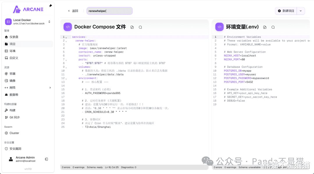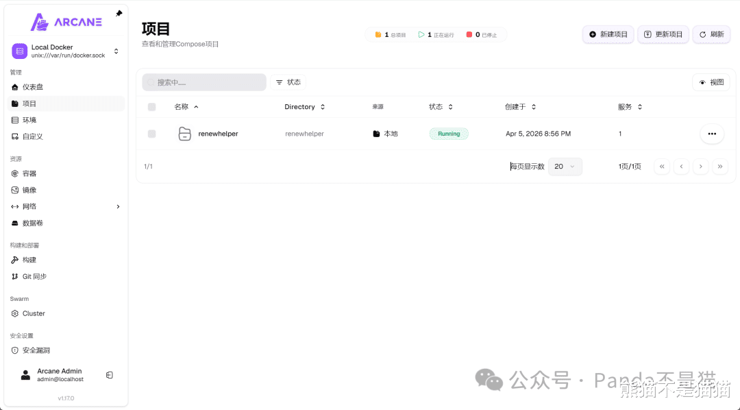 部署完成之后通过端口访问输入你设置的登录密码即可,通过Arcane部署的项目,熊猫实测在绿联NAS以及极空间NAS的Docker管理界面也都有对应的项目展示,其他NAS没有测试过。(在极空间中不能编辑和查看compose文件)