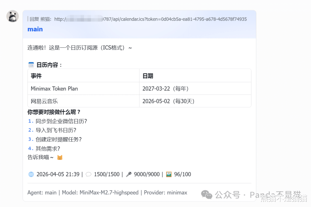 RenewHelper提供了日历订阅的服务,这就意味着我们可以将其发给我们的龙虾,让它来管理我们的订阅服务,把链接直接发送给龙虾让它对接就行,这里要注意IP记得改成你的NASip地址。
