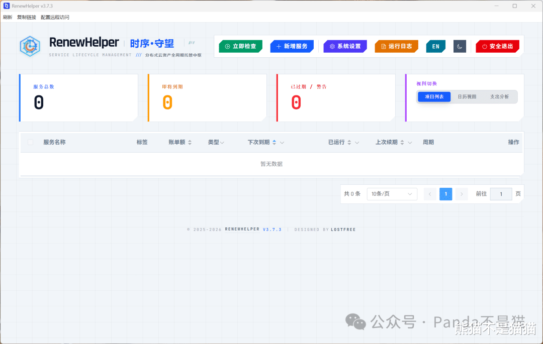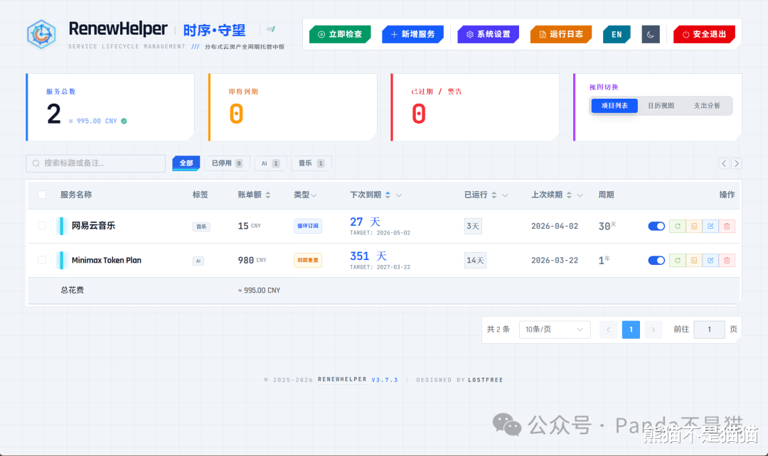 前两天刷GitHub的时候,突然看到了这个项目——RenewHelper 时序·守望。零成本托管、机甲风UI、支持农历计算、还能多渠道推送提醒,项目的开源地址为:https://github.com/ieax/renewhelper。于是乎,熊猫上手部署了一个,折腾了几天,今天就来聊聊这款工具究竟能不能治好我的续费焦虑......