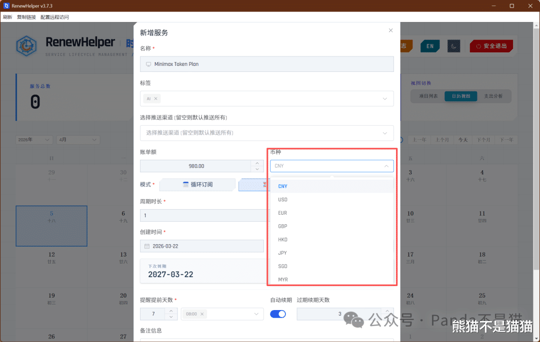 点击上方功能区的新增服务,填写名称,例如Minimax Token Plan,标签按照订阅服务的类型设置就行,再往下是推送渠道,这个后面咱们再说。再往下则是订阅金额设置,币种支持还是蛮多的。