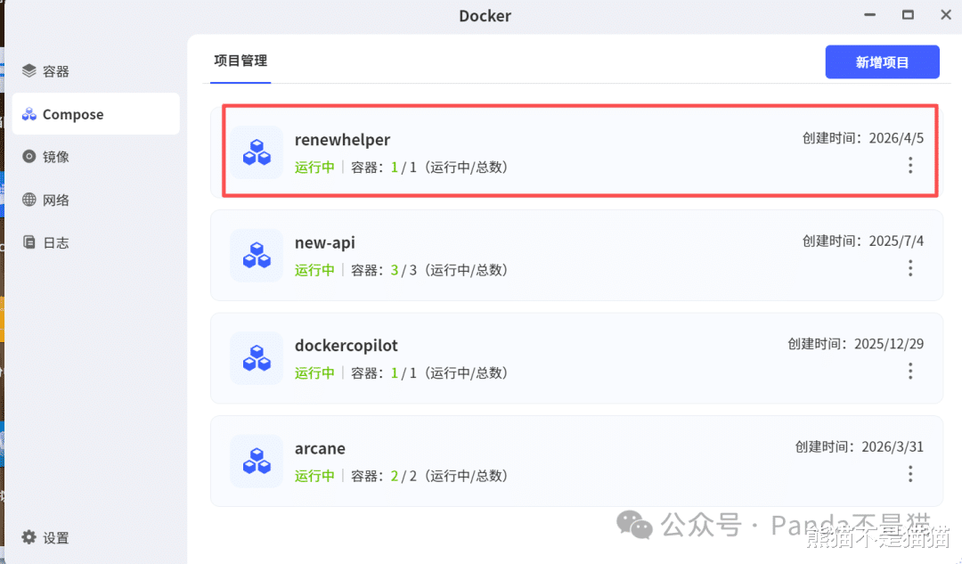 services: renew-helper: # 官方镜像地址 image: ieax/renewhelper:latest container_name: renew-helper restart: unless-stopped ports: - "9787:9787" # 将容器内部的 9787 端口映射到宿主机的 9787 volumes: # 数据持久化:将宿主机的 ./data 目录挂载进去,防止重启丢失数据 - ./renewhelper/data:/data environment: # --- 核心配置 --- # 1. 登录密码 (必填) - AUTH_PASSWORD=panda # 2. 定时任务频率 (关键配置) # 建议:设置为每30分钟运行一次,不要修改!!! # 语法:"0,30 * * * *" 表示在每小时的第0分和第30分各触发一次。 - CRON_SCHEDULE=0,30 * * * * # 3. 容器时区 # 决定了 Cron 什么时候"醒来",建议设置为你所在的地区 - TZ=Asia/Shanghai